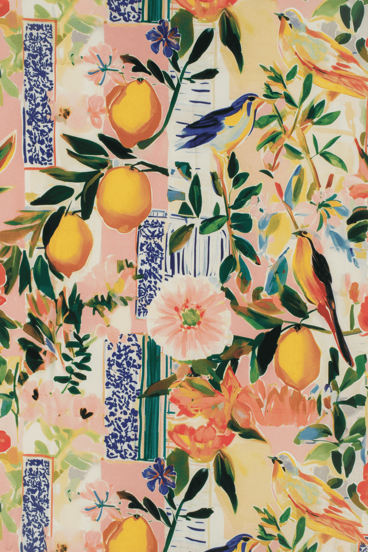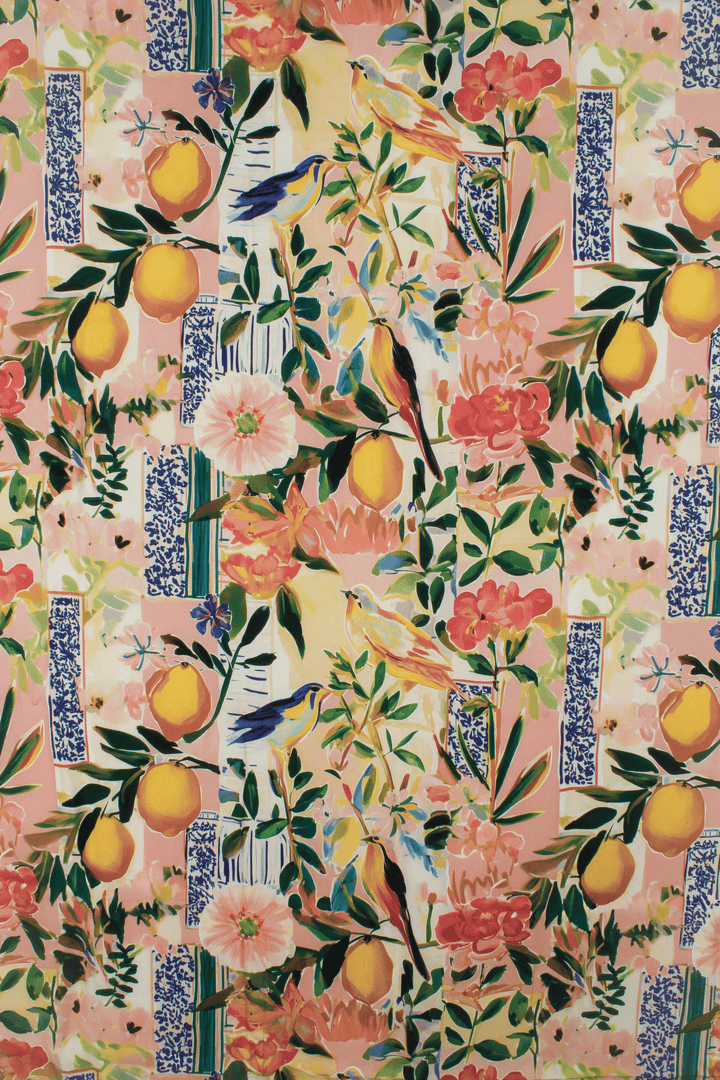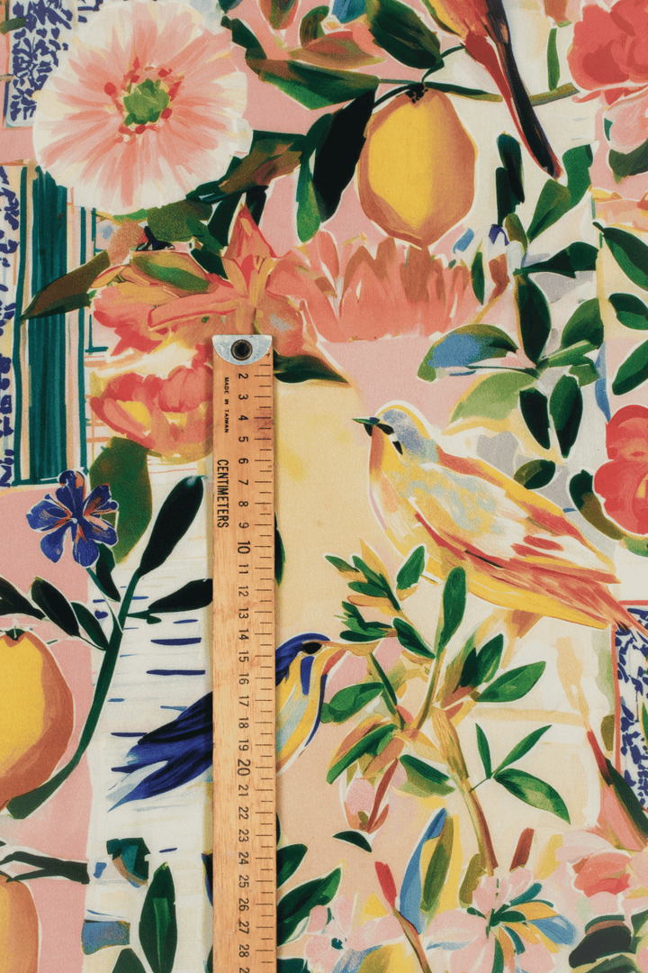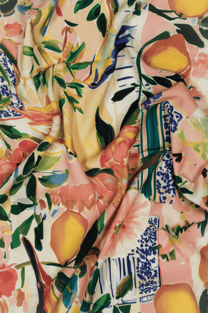 Composition is Viscose 100,00%. Width is 145cm. Weight is 118.5 grams per square meter.