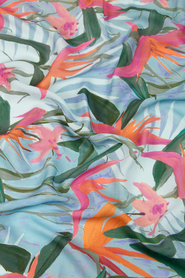 Composition is Viscose 100,00%. Width is 140cm. Weight is 125 grams per square meter.